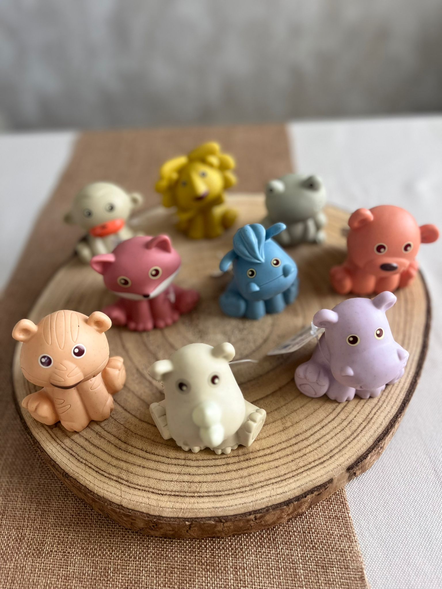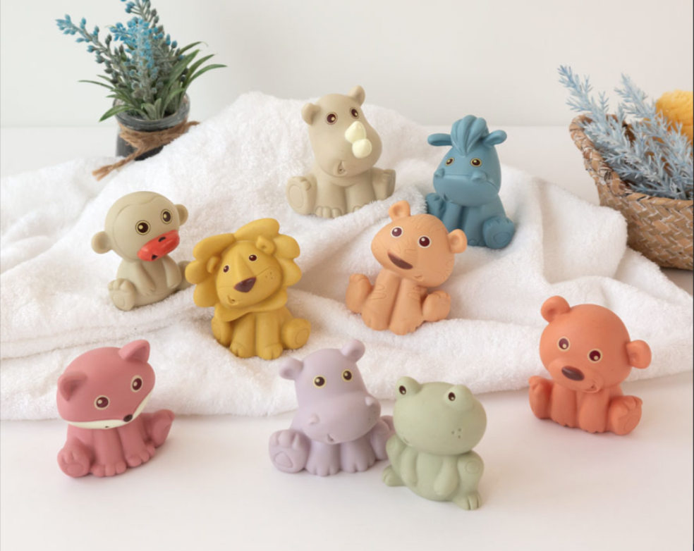 | Color | Azul hipo, zorrito rosa, oso naranja, rana verde, Morado clarito hipo, verde mono, león amarillo, beige rino, tigre salmón |